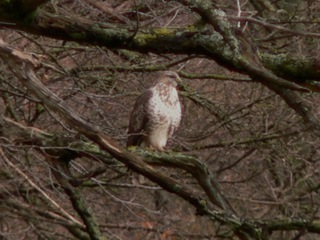 Während dem Hochstapfen auf einer Teerstrasse (schnauf, schnauf) leuchtete mir etwas helles aus dem Baum über der Strasse entgegen. Ich staunte nicht schlecht. Wir haben in dem Revier einen Bussard, fast weiss. Aber hier war ich nun definitiv ausserhalb seines Revieres, also konnte es kaum dieser Vogel sein. Ich machte einige Bilder und er liess mich erstaunlich nahe ran, auch das sprach gegen den weissen Bussard, der ist recht scheu. Als er dann wegflog, stellte ich fest, dass er nur eine helle Brust hat, der Rest ist braun. Im Gegensatz zu unserem weissen Bussard. Der ist fast schneeweiss und hat nur dunkle Handschwingen....