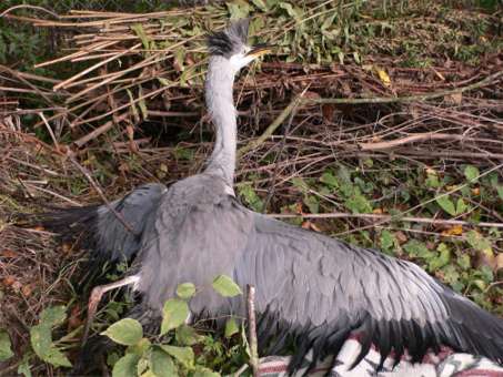 07.10.10: Früh morgens Besuch beim Reiher. Immer noch unverändert liegt er im Gras, das Futter hat er nicht angerührt. Als ich näher komme, wehrt er sich kaum. So, jetzt ist fertig, da gibt es keine Hoffnung mehr. In der Tierklinik wird er nun von seinen Leiden erlöst!