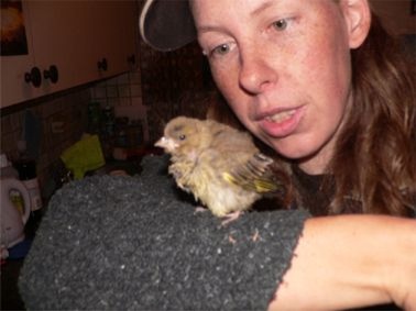 17.08.10: gestern abend habe ich den Entschluss gefasst, den kleinen Grünfink an Sandra abzugeben. Sie hat ein ganzes Zimmer eingerichtet für ihre Kanarienvögel, die können sich dort frei bewegen, haben diverse Futterstellen, Sandbäder, Wasserbäder und viele Bäume und Aeste zum Sitzen. Da der Grünfink ziemlich nahe verwandt mit den Kanarienvögeln ist, haben sie natürlich ähnliche Verhaltensweisen und ernähren sich auch fast gleich. So kann der Grünfink von den Kanaris nun viel lernen und sobald er gut fliegen und alleine fressen kann, wird Sandra ihn auswildern.
