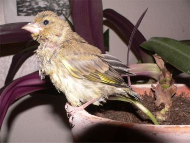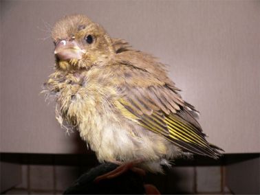 "Es" stellte sich dann anhand mir zugeschickter Fotos, als Grünfink heraus. Und bei Grünfinken ganz speziell: sie sind auch während der Jungenaufzucht, absolute Pflanzenfresser! Also nichts mit Insekten füttern, das hat er bald mit blutigem Kot quittiert. Wieder einmal Kontakt zur Wildvogelhilfe dort bekam ich wie immer kompetente Auskunft. Die Dame hat das verlange HANDaufzuchtpulver (Nutri Bird A21) dann auch gefunden und fortan gedieh der kleine prächtig.