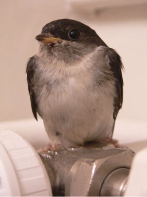 Eine Mehlschwalbe, sie ist eigentlich so gut wie erwachsen, fliegt aber noch nicht richtig und ist auch ziemlich scheu. Inzwischen muss sie aber nicht mehr zwangsgefüttert werden sondern pickt von der Pinzette. Auch sie war bei 7 vor 7 zu sehen, bei der Fütterung. Ich denke, die kleine kann bald raus....